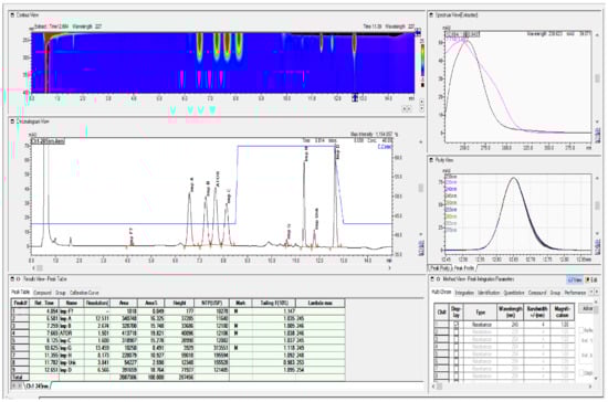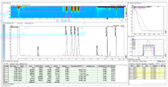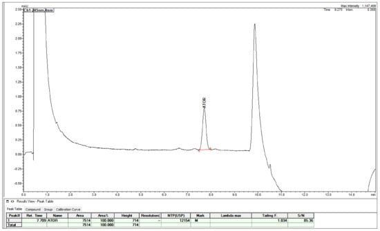 During the method development, we focused on choosing a selective and simple mobile phase and appropriate chromatographic in order to achieve successful, effective, rapid, and reproducible separations. The column Shim-pack XR II C18 75 mm × 3 mm, 2.2 µm achieved the best separation with the highest values for critical pair resolutions, during the shortest run time analysis, with about 10% higher backpressure compared with other columns with identical dimensions and particle size. The theoretically calculated number of theoretical plates using the equation N = L/2dp corresponded to the software calculated number of about 11,835 for the peak of atorvastatin, which can be seen in the table below the chromatogram presented in Figure 4.