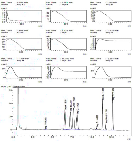 Chromatogram of atorvastatin and its impurities, presenting their characteristic UV absorption spectra.