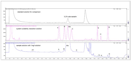 Summary overview of the selectivity and sensitivity of the method in 3 chromatograms illustrating: sample solution prepared from atorvastatin tablet (bottom), system suitability solution (middle), and diluted test solution corresponding to 0.2% atorvastatin (top).