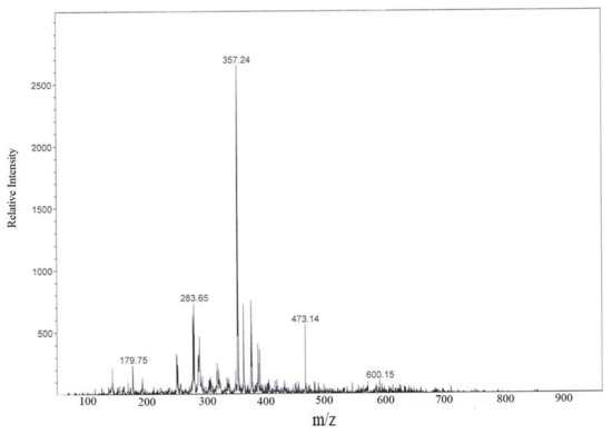 Mass spectrometry was carried out on subfraction C2, where the results were revealed in Figure 1. The data of the spectral peak appearances from mass spectrometry, based on the compound’s fragmentations, are presented in Table 3. The detected subfraction C2 has peaks at m/z 467, 457, 410, 357, 344, 325, 284, 257 and 200, which are consistent to the reported MS profile of taraxerol acetate (C32H52O2, molecular weight = 468.76 g/mol) [21]. The fragmentation pattern of taraxerol acetate compounds can be seen in the previously published report [21]. The structure was confirmed by the absence of hydroxyl group and the presence of C-O esters and C=C double bound in the FTIR spectrum (Table 2).