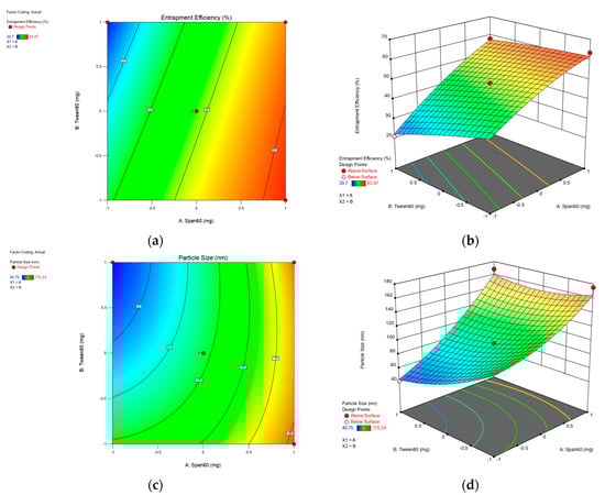 It can be concluded that increasing the Span 60 concentration significantly increases the particle size (p < 0.0001), as shown in Figure 1c,d. Additionally, the Tween 80 concentration significantly decreased the particle size (p < 0.002). This is due to the unsaturation of the alkyl chain, allowing chain bending and results in a smaller size. Additionally, a high Tween 80 concentration reduces the interfacial tension, causing particle portioning [33].