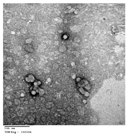 A 1:1000 dilution with water was done for the tested sample. A drop of the sample was allowed to settle on a mesh carbon-coated copper grid for 35 min. An absorbent paper was used to remove excess fluid. The sample was stained with uranyl acetate stain and examined by TEM (JEM 1010, JEOL Ltd., Tokyo, Japan) with an acceleration voltage of 70 kV and magnification power of 50,000×.