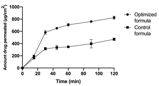 This improvement in drug permeation could be explained by the nano-size of the optimized formulation and the presence of surfactants [19]. Tween 80 has been reported to increase the permeation across biological membranes such as the nasal membrane and BBB [40]. Spanlastic content in surfactants has been reported to facilitate vesicle squeezing intercellularly and their permeation due to the elastic effect [41]. This elasticity improves the skin penetration capability of the vesicles. Moreover, the vesicles maintain their integrity, achieving enhanced delivery of the entrapped drug [42]. Additionally, permeation with better interaction with the skin layers could be related to Span 60 vesicles, due to the low HLB value (HLB = 4.7) [43].