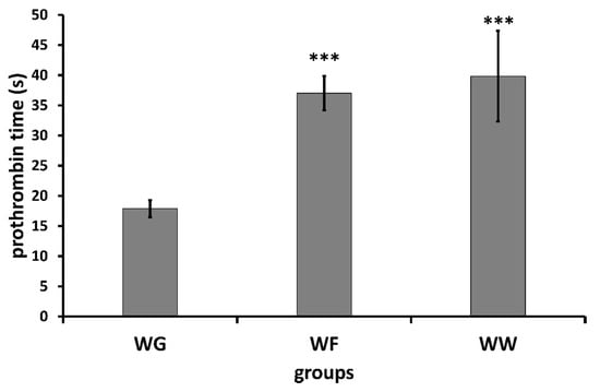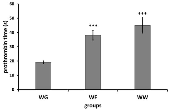 Mean ± SD of prothrombin time determined by means of optical coagulometer (WG: wheatgrass; WF: warfarin; WW: wheatgrass + warfarin). *** p < 0.01.