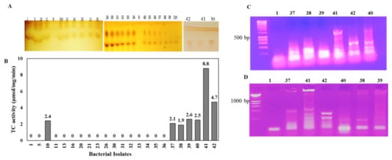 Twenty-three endophytic bacterial isolates were recovered from the surface of sterilized leaves of Mentha x piperita L., Coriandrum sativum L., Anethum graveolens L., Moringa oleifera Lam., and P. gracilior on the media PDA, beef–yeast extracts glucose, and nutrient agar (Table S1). These bacterial isolates were purified and stored on nutrient agar media. The TDS producing potency of the recovered bacterial isolates were assessed by being grown on PDB for 4 days at 30 °C, and the cultures were pelleted and pulverized in liquid nitrogen, and the intracellular proteins were extracted, and the enzyme activity and concentrations were determined by the standard assay. Among the recovered bacterial isolates, seven bacterial isolates, # 10, 37, 38, 39, 40, 41, and 42, displayed the highest potency for TDS production (Figure 1). The highest TDS activity was produced by bacterial isolate # 41 (8.8 µmol/mg/min), followed by isolate # 42 (4.7 µmol/mg/min), while TDS production ranged between 1.9–2.6 µmol/mg/min for bacterial isolates # 10, 37, 38, 39, and 40. Interestingly, the highest TDS-producing bacterial isolates (#41, 42) were isolated as endophytes of P. gracilior, which is the host of the Taxol-producing endophytic fungal isolate A. terreus [9,18]. The TDS activity was clearly revealed from the residual concentration of GGPP on the TLC chromatogram, as shown on Figure 1 (upper panel). The biosynthetic potency of TDS was confirmed from the nested-PCR detection of the tds genes that were designed based on the conserved active sites sequences of the TDS from different fungal and plant sources. The metabolic producing potency of TDS by isolates 41 and 42 was confirmed from the positive PCR amplicons from the specific active site-designed tds primers (Figure 1C,D) compared to the negative TDS-producing bacterial isolates. The amplicons of tds1 were about 500 bp for bacterial isolates # 41 and 42, while the tds2 amplicons were approximately 300 bp for both bacterial isolates, and there was an absence of PCR amplicons for the negative enzyme-producing isolates.