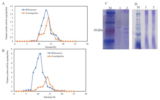 Taxadiene synthase was purified from the potent bacterial isolates S. maltophilia and B. koreensis, which were grown on the nutritionally optimized medium from the response surface methodology designs. After incubation, the bacteria cells were pelleted, and the intracellular proteins were extracted, and the TDS was purified by the size-exclusion and ion-exchange chromatographic approaches [40,41,42,47]. The protein fractions were eluted from the columns, and the TDS activity and concentration were determined by the standard assay. Apparently, the active TDS fractions from both chromatographic approaches displayed relative proximity in terms of their molecular mass and overall charge (Figure 4). The overall purification profile of both of the bacterial isolates is shown in Table 3. When the gel-filtration step was used, the TDS activity from B. koreensis and S. maltophilia increased by 2.9- and 10.6-fold, while when using ion-exchange chromatography, the enzyme activity increased by about 15.9- and 14.6-fold, respectively. By the last purification, the specific activity of the purified TDS in B. koreensis and S. maltophilia was 6.84 µmol/mg /min and 1.7 µmol/mg/min, respectively. The overall purification yields of TDS from both of the bacterial isolates were 19.2 and 16.9%, respectively.