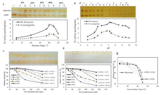 Biochemical properties of TDS from S. maltophilia and B. koreensis. The effect of reaction temperature (A), reaction pH (B), thermal stability profiles of B. koreensis (C), and S. maltophilia (D). For each assay, the TLC chromatogram of the residual GGPP is placed in the upper panel, while the actual activity of TDS is in the lower panel. (E), Profile of half-life temperature (Tm) of purified TDS of S. maltophilia and B. koreensis.