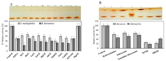The molecular homogeneity of the active TDS fractions was checked, and the most homogenous molecular fractions were gathered and concentrated prior to the next purification step. The entire molecular mass and molecular subunit structures of the purified TDS from both bacterial isolates were determined from the native-PAGE and SDS-PAGE analyses (Figure 4). From the native-PAGE, the entire molecular mass of the purified TDS from both of the bacterial isolates displayed approximately 180 kDa. Under denaturing conditions, the purified TDS from B. koreensis and S. maltophilia were recorded to be 65 and 80 kDa, respectively. From the native and SDS-PAGE, the purified TDS from the bacterial isolates had two identical subunits, meaning that it had a homodimeric identity.