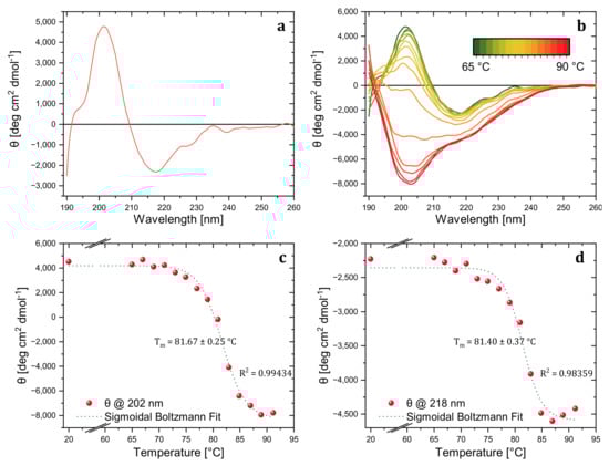 - Greenfield, N.J. Using circular dichroism collected as a function of temperature to determine the thermodynamics of protein unfolding and binding interactions. Nat. Protoc. 2006, 1, 2527–2535. [Google Scholar] [CrossRef]