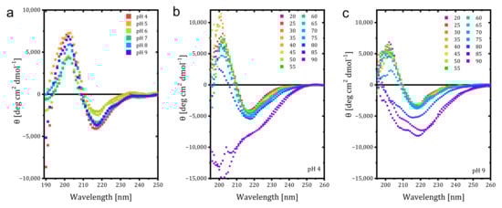 Additional studies with CD were conducted, and the effect of pH on the Far UV CD spectrum of trastuzumab at 20 °C is given in Figure 2a. A decrease in the positive peak CD signal was observed at pH 6 and 7, whereas the magnitudes of the negative peak signals decreased for pH 5 and 6, corresponding to less β-sheet content than at higher pH values. Low pH destabilized the mAb structure with decreased Tm, even though it retained native structure [20]. Due to higher positive charge density at lower pH, charge repulsion prevents aggregation and can be indistinguishable from native mAb in secondary structure but become thermally less stable. In our study, higher content of β-sheet was observed at higher pH values without any shift, which could be related to increased aggregation to avoid more exposure to the hydrophobic region. It is also known that the increased β-sheet causes further aggregation. Next, temperature-wavelength measurements were conducted for each pH value, and the results for pH 4 and 9 are given in Figure 2a,b. While the irregular structural elements started to be seen at 85 °C for pH 4 and 5, the value decreased to 80 °C for pH 7 and 9. This shows that disruption of the secondary structure started earlier for pH values 7 and higher, and the acidic solvents provided better resistance against thermal unfolding. Our results differ from reports in the literature that lower pH decreases thermal stability but is consistent with the low aggregation and counterbalanced hydrophobic attraction with electrostatic repulsion [18]. The CD findings also match the volume and number-based hydrodynamic size measurements by DLS in stability comparison (Figure 5).