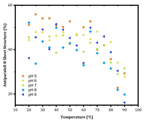 As a next step, the thermal denaturation curve for each pH was plotted to find the melting temperature and observe the unfolding onset temperatures (data is not shown). Gradual thermal unfolding of trastuzumab at pH 4 and 5 was observed to start at around 50 °C, and the corresponding Tm values were calculated as 81.10 °C and 82.61 °C by Boltzmann fit. On the other hand, the sudden drop in CD values after 75 °C was observed for pH 6, 7, 8, and 9, and their Tm values were found as 80.81 °C, 79.64 °C, 81.61 °C, and 80.08 °C, respectively. The smallest Tm was observed for pH 7, and the highest was for pH 5. Although Tm values at lower pH values were high, the onset temperature where the structural change started to occur appeared at a lower temperature. This shows that mAbs rearrange their structures earlier at lower pH and show resistance to aggregation. Lastly, the antiparallel β-sheet content of trastuzumab is shown in Figure 3 as a function of pH. At thermal unfolding temperatures, a decrease in the antiparallel β-sheet structure was observed (Figure 3) as an indication of the leading cause of aggregation as secondary structure disruption.