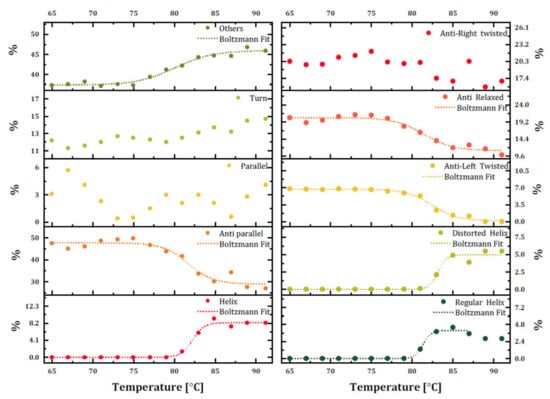 The secondary structure content of trastuzumab was monitored using BeStSel with raw ellipticity (mdeg) data for each temperature ramp (Figure 4) to overcome intrinsic limitations of CD and observe the temperature-dependent change of each structural unit rather than an overall implication of secondary structure change. The dominant β-sheet structures are found in mAbs and were confirmed as the dominant structure with 47.5% content in trastuzumab. The percentages of secondary structure units at 20 °C (0% helix, 50.4% β-sheets, and 37.7% others) were similar to the secondary structure of trastuzumab in PBS, determined by the same method (6.1% helix, 55.7% β-sheets, and 38.3% others) [21]. However, our results did not contain any helix structure with weaker hydrogen bonds on their backbone than that of β-sheets, and these secondary structures mainly were adopted at a more hydrophobic medium. The secondary structure assessment of the temperature-based CD measurement of trastuzumab proved that while the temperature increased, antiparallel β-sheet content decreased to 31.1%, and other structures, including random coils, increased to 45.9%, which is an indicator of mAb denaturation.