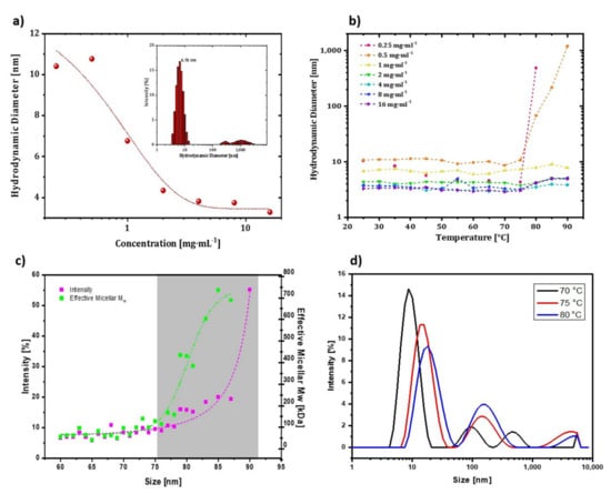Tagg, the onset of trastuzumab was investigated between 20–90 °C by 5 °C interval steps. The changes in molecular weight and intensity-based hydrodynamic diameter following temperature increment are given in Figure 5c. These parameters dramatically increased effective micellar molecular weight and diameter, starting at 75 °C. The diameter did not change dramatically before since the solvent–protein interaction forces were superior to those of the protein-protein interactions. After aggregation started at 75 °C, the hydrodynamic diameter increased gradually because more mAb molecules lost their colloidal stability and were associated with each other, forming aggregates. Figure 5d shows the intensity-based hydrodynamic diameter change of trastuzumab at 70–75–80 °C. When the temperature rose from 70 to 80 °C, the intensity corresponding to the mAb monomer decreased, and a shift was observed at slightly higher diameters. The unfolding of different parts of an mAb can accelerate the aggregation events due to the exposure of the hydrophobic residues to the solvent. Tagg, onset was 75 °C, which agreed with the melting temperature range (73–76 °C) determined previously by CD measurements [21]. It is worth mentioning that even though the Tagg, onset corresponded to the melting temperature of trastuzumab, it may take place after or just before the unfolding of the structure. Thus, DLS can be used for a rough but practical estimation of the melting temperature. As a result, a clear understanding can be developed by using CD as a complementary method to DLS for thermal stability studies.