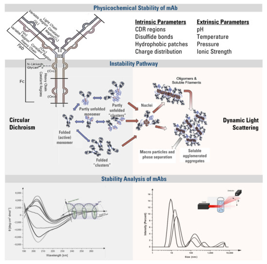 The secondary structure is defined by the spatial arrangement of the atoms of amino acid residues found in the polypeptide backbone. Regular secondary structures such as α-helix and β-sheet occur when the angle between the polypeptide backbones remains stable throughout a segment [7]. The secondary structure of an mAb is disrupted when the hydrophobic regions and aggregation-prone residues (APRs) are exposed to solvent. As represented in Scheme 1, this reduces the solubility and makes the molecules available for strong inter-protein contacts, leading to the formation of reversibly folded oligomers, clusters, or irreversible aggregates [3]. As a result of aggregate formation, Fab regions may lose antigen-binding activity, resulting in immunogenic reactions that reduce the efficacy by neutralizing the mAb, and hypersensitivity due to the cross-reactions with an endogenous counterpart.