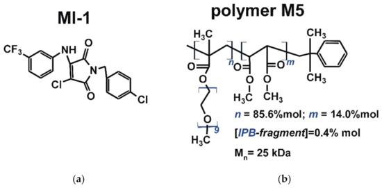The structure of (a) maleimide derivative MI-1 (1-(4-chlorobenzyl)-3-chloro-4-(3-trifluoromethylphenylamino)-1H-pyrrole-2,5-dione) and (b) polymeric carrier poly (PEGMA-co-DMM) (M5) [24,33].