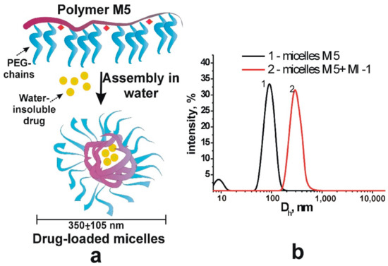 Scheme (a) of the formation of stable micellar structures filled with drugs and (b) hydrodynamic diameter of polymer micelles M5 and drug-filled micellar structures (M5 + MI-1).