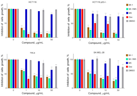 The GI50 of MI-1/M5 in HeLa cells equaled 5.43 μg/mL, while the GI50 of MI-1 in these cells was 7.22 μg/mL (Table 1). MI-1/M5 complex was more toxic (p ≤ 0.01) for the SK-MEL-28 cells than the MI-1, and the GI50 of MI-1 was 3.17 μg/mL, while the GI50 of MI-1/M5 was 1.00 μg/mL. It is worth noting that tested tumor cells were resistant to treatment with free polymeric carrier (M5) or DMSO and the GI50 ˃ 50 μg/mL (Figure 3, Table 1). While a known chemotherapeutic agent, doxorubicin, possessed high toxicity towards HCT116, HCT116 p53-/-, HeLa, and SK-MEL-28 cells with the GI50 value of 0.58 μg/mL, 3.60 μg/mL, 0.64 μg/mL, 0.98 μg/mL, respectively.