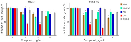 The cytotoxicity of maleimide derivative MI-1, its complex MI-1/M5 with polymeric carrier, free polymeric carrier poly (PEGMA-co-DMM) (M5), doxorubicin (Dox), and solvent DMSO towards pseudo-normal cells: human keratinocytes of HaCaT line and murine fibroblasts of Balb/c 3T3 line. The effect was measured by the MTT assay under 72 h cell exposure. Data are presented as the mean ± SD. * p < 0.05; ** p < 0.01; *** p < 0.001 compared with control (non-treated) cells.