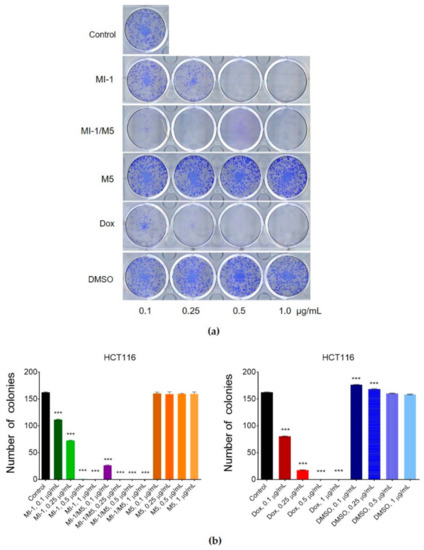 The clonogenic assay was conducted using the modified protocol described previously [39]. The HCT116 cells (750 cells/1 mL) were seeded in a 12-well plate. After adhesion, cells were treated with the MI-1, MI-1/M5, M5 or doxorubicin (all at 0.1; 0.25; 0.5; 1.0 µg/mL) for 7 days. Then, the cells were washed with the phosphate buffered saline (PBS), fixed with cold methanol for 10 min. Cells were stained with 0.5% crystal violet dye in 25% methanol for 10 min. Cells were washed with the PBS. The colonies were counted using ImageJ software as open source.