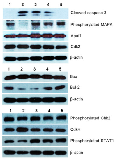 The primary antibodies against a Cleaved Caspase 3 (Asp175), EndoG, Apaf1, phosphorylated form of MAPK, Cdk2, Cdk4, Bax, Bcl-2, phosphorylated Chk2, phosphorylated STAT1, beta-actin (Cell Signaling Technology, Vienna, Austria) were used. Secondary peroxidase-conjugated antibodies (Cell Signaling Technology, Vienna, Austria) were applied at a working dilution of 1:5000 according to the manufacture’s recommendations. The enhanced chemiluminescence (ECL) detection reagent (Sigma-Aldrich, St Louis, MO, USA) was used for protein visualization. The densitometric analysis of protein content was conducted using the ImageJ software as open source [41].