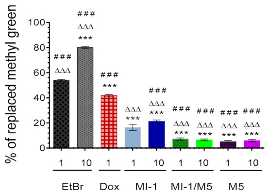 The percentage of methyl green dye replaced from its complex with DNA by the MI-1 (1, 10 μg/mL), MI-1/M5 complex (1, 10 μg/mL), free M5 polymer (1, 10 μg/mL), and reference compounds-doxorubicin (Dox, 1 μg/mL) and Ethidium bromide (EtBr, 1 and 10 μg/mL). *** p < 0.001 (significant changes compared with the effect of EtBr (1 μg/mL); ΔΔΔ p < 0.001 (significant changes compared with the effect of Dox (1 μg/mL); ### p < 0.001 significant changes compared with the effect of MI-1 (1 µg/mL). Data are presented as mean ± SD.