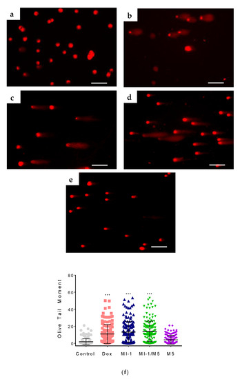 The DNA damage induced by studied compounds in colon carcinoma HCT116 cells (according to the results of alkaline DNA comet assay): (a) control; (b) doxorubicin (Dox, 0.9 µg/mL); (c) MI-1 (0.9 µg/mL); (d) complex MI-1/M5 (0.9 µg/mL); (e) polymer M5 (0.9 µg/mL); (f) quantitative data of DNA damage (Olive Tail Moment) in treated HCT116 cells. *** p < 0.001 (significant changes compared with control (non-treated) cells). Scale 50 µm.
