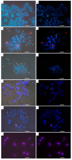The morphological examination of HCT116 cells treated with studied compounds was conducted by using double staining of chromatin with Hoechst 33342 (blue fluorescence) and Propidium iodide (red fluorescence). The MI-1 compound and MI-1/M5 complex triggered changes in shape of treated cells and their membrane blebbing (marked with white arrows) (Figure 10c–f). Besides, the MI-1 caused chromatin condensation (marked with yellow arrows) and micronuclei formation (marked with pink arrows) (Figure 10c,d). The condensed chromatin and membrane blebbing are typical proapoptotic changes revealed in cells induced to apoptosis [58]. The M5 polymer (Figure 10g,h) and DMSO (Figure 10i,j) did not cause pronounced morphological changes in the treated HCT116 cells.