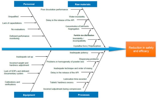 According to the ICH Q9 guideline on Quality Risk Management [47], CQAs, CMAs, and CPPs can be identified through adequate risk management, as it detects those problems in the development of the product and their associated risks [48,49]. In general, nine tools are recommended for risk management. However, among the most widely used tools are Ishikawa’s fishbone diagram (Figure 2) [44] and the Failure Mode and Effects Analysis (FMEA) [48,50,51]. These two tools are thoroughly explained to the Pharmacy students in Drug Analysis courses.