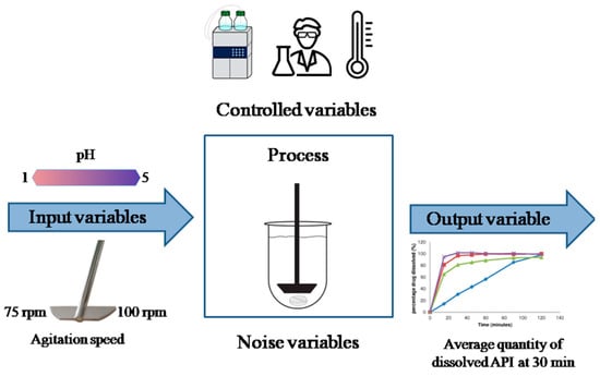 In addition, DoE allows researchers to use their knowledge regarding the product and/or process instead of merely applying the commonly known “trial and error” [52,53]. This tool is used to organize, conduct, and interpret the results of experiments efficiently, guaranteeing the collection of the greatest possible amount of useful information through the execution of a small number of tests. The main objective of an experimental study is to find the relationship between independent variables (i.e., factors) and dependent variables (i.e., responses) that affects a certain process and its final product (Figure 3) [54]. An adequate DoE can help identify optimal conditions, CMAs, CPPs, and their impact on CQAs [55].