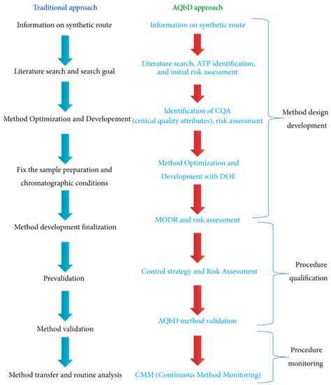 QbD can also be expanded to analytical methods for the quality control of pharmaceutical formulations, also known as Analytical Quality by Design (AQbD), which is different from the classical approach for Analytical Method Development (Figure 5) [100]. AQbD demands that the goal to be achieved is initially defined, i.e., the analytical target profile, as well as properly selecting the analytical method from the different alternatives that are systematically evaluated. This allows a well-understood method to be obtained that not only exhibits the best performance but also has the possibility to be improved, if necessary. As the next step, a control strategy is designed and established to manage risks and guarantee robustness. Then, the validation of the method is developed, and finally, continuous monitoring is mandatory throughout the lifecycle [101].