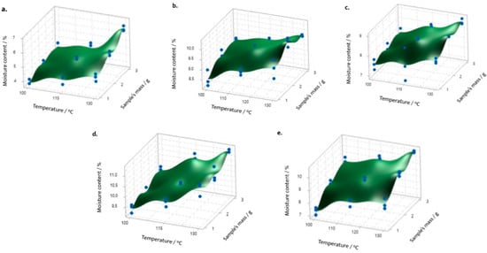 Example of a 32 full factorial design carried out in the Academy to evaluate the moisture content (%) in natural raw materials as a function of the balance’s temperature (°C) and sample’s mass (g): (a) Camelia sinensis, (b) Cassia fistula, (c) Chamaemelum nobile, (d) Lippia alba, and (e) Tilia platyphyllos. Reprinted with permission from Castillo, L. et al. Borneo Journal of Pharmacy, 3(1). Copyright (2020) Institute for Research and Community Services Universitas Muhammadiyah Palangkaraya [105].