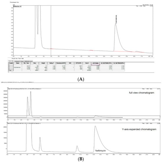 The prompt for the development of a simpler, rapid, reproducible, selective and accurate method for the quantification of fosfomycin in its trometamol form was the focus of the chromatogram obtained in our lab by implementing the official pharmacopeial PhEur, BP monograph method, with the use of a Zorbax NH2-amino column 250 mm × 4.6 mm, 5 μm particles with 80 mM potassium phosphate untreated buffer at 1 mL/min flow rate, and the injection of 10 μL of 120 mg/mL standard fosfomycin trometamol on the column, which yielded the chromatograms presented in Figure 1A,B.