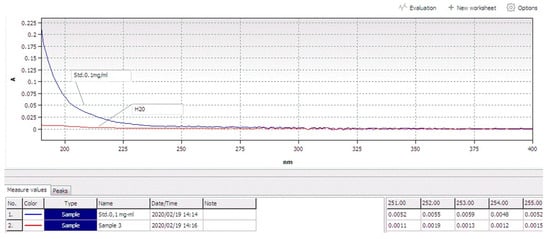 UV-Vis absorption spectrum of 0.1 mg/mL pure standard of fosfomycin trometamol in water; the blue-lined spectrum was overlapped with and masked by trometamine residue.