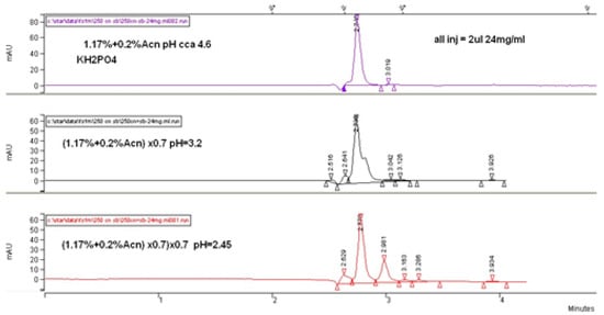 Figure 2 explains the practically UV-invisible molecule due to the lack of chromophore group or double C=C bonds and a small, highly acidic epoxy-ring-based molecule with pKa values of pKa1 = −4.3 and pKa2 = 1.25, which makes it almost impossible to suppress dissociations and ionization in a nominal pH range of the RP columns to obtain a neutral molecule, which should be retained in reversed-phase-based column matrixes. If this was successful, the first inappropriate feature was overcome by employing the monitoring visibility in the lowest UV region below 190–200 nm. For this purpose, we developed a concept of the mobile phase constituents that could be used in this region with the lowest possible UV-cut off values, which limited the organic solvent choice to the use of acetonitrile as the first and unique choice of an organic solvent modifier for the reversed-phase separation of fosfomycin trometamol. For the same reasons, the use of salts other than phosphates for buffering, such as formiates, acetates and citrates, would be fully impractical because of their higher UV absorptivity. These expand the same for acids as modifier’s, no use of acetic, formic, citric, trifluoroacetic acid was used for the mobile phase composition.