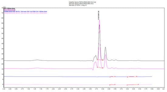 Chromatograms with YMC C18- Triart 150 mm × 4.6 mm, 3 μm with injected 1 μL sample substance FSF with 21 mg/mL and mobile phase with 0.28% v/v—Heptylamine pH adjusted to 6 and +10%Acn.
