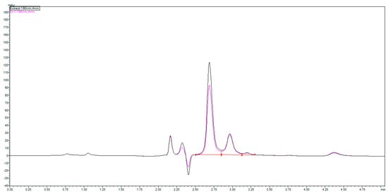 In further work, we performed the testing applicability of another vendor of the LiChrospher-CN column by checking the stability of the granulate from the fosfomycin at room temperature in an opened bottle, both with a prepared and dissolved standard solution and a sample solution. The next chromatogram in Figure 7 clearly shows the appearance of the degradation products with the reduction in the quantity of an active pharmaceutical ingredient, Fosfomycin, on the column.