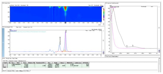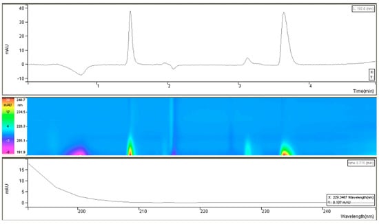 As can be seen from Figure 18, using the 2-aminoheptan at a concentration 25 mM and a pH of 5.8 yielded very good chromatogram selectivity, retention and satisfying peak symmetry in the range 1.7–1.89 depending on the injected analyte. The elution position of fosfomycin was not jeopardized and the trometamol was eluted first at the retention of about tR = 1.2 min. Figure 19 illustrates the change in the peak size and profile of all the peaks present on the chromatogram monitored at 11 channels with increments of 1 nm. This is a consequence of the highly dependent and distinguished change in UV absorptivity of fosfomycin in the lowest measurable range of 190–200 nm. This situation confirms the method selectivity and applicability with the usage of alkylamine as the ion-pairing agent using reversed-phase chromatography.
