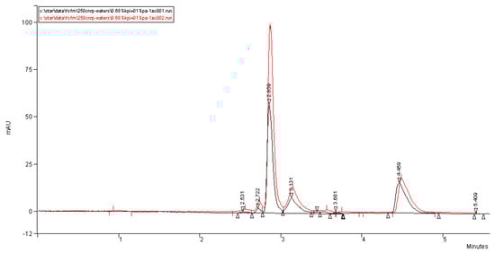 Chromatograms of 14 mg/mL solution of fosfomycin trometamol on a Waters Xterra C18 MS 250 mm × 4.6 mm, 5 μm column with the usage of 0.25% v/v Hexylamine as the ion-pairing amine adjusted to pH 6 with 85% o-H3PO4 and added 7% acetonitrile at 40 °C, 1 mL/min flow rate.