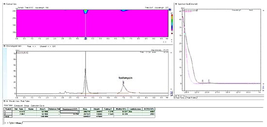 Our primary results during the investigations concluded that a more acidic phosphate buffer composed of a mobile phase generates higher retention and selectivity in the context of following a logical conclusion for higher retention of ionogenic molecules as a result of higher ionizing suppression. Thus, a stronger interaction of fosfomycin peak on the column was enabled. These hypotheses were confirmed in Figure 3 and Figure 4, which clearly show increasing peaks of the fosfomycin run time with increased acidity of the mobile phase by decreasing the pH values.