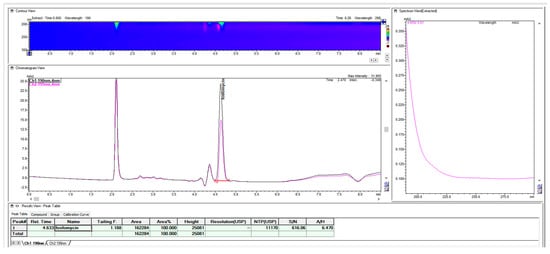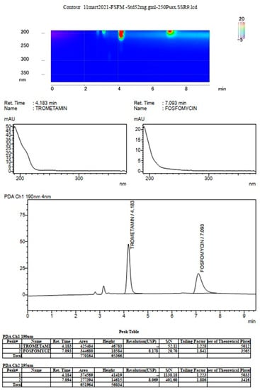 The chromatogram in Figure 13 performed with the Discovery C18 150 mm × 4.6 mm and 5 μm columns appear to achieve a relatively symmetric peak of fosfomycin trometamol, t5% = 1.87, and was well retained and separated from another component peak. In all reversed-phase chromatography analyses, C18 or octadecylsilane matrix-filled columns were used to maximize the retention of fosfomycin. A comparison of 192/195 nm was used to check the differences in sensitivity in the calculating factor. If newer HPLC generation equipment was used, a 190/195 nm relation is used. However, previous generations of Varian equipment do not allow for the use of wavelengths below 192 nm for calculation and presentation—their lowest point is 190 nm. In further research activity, we performed a variety of experimental conditions, chromatographic columns with different features from different vendors, changes in the mobile phase constituents, percentages of added organics solvents, concentrations of fosfomycin analytes in solution, and even different chromatographic systems of different concepts, generations, performances and vendors.