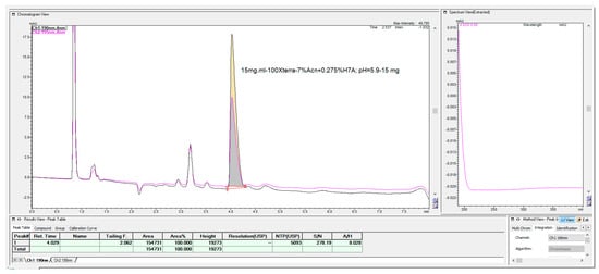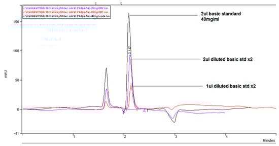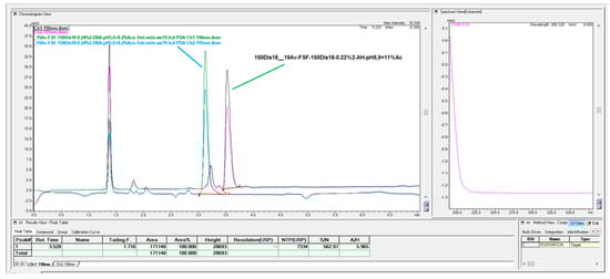 Figure 14 illustrates the shape of the chromatogram with a slightly changed mobile phase with 1% less organic acetonitrile in the mobile phase on the same Discovery C18 column 150 mm × 4.6 mm, 5 μm, and worked on Shimadzu Nexera LC-40 and obtained an almost identical system suitability parameters of the chromatogram, with an asymmetry Tailing Factor = 1.89, Retention time tR = 3.42, where 0.22% hexyalmine was used at pH = 6.1 with 30 mg/mL target sample of analyte concentration. These results confirmed the presumption that RP columns can efficiently balance a higher quantity of injected quantity of analyte molecules on the column. A comparison of two different mobile phases with different alkylamines and concentrations of acetonitrile mobile phase analyzed on the same Discovery C18 150 mm × 4.6 mm column with 5 μm particles is shown in Figure 15.