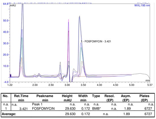 As a final research conclusion, the goal was for the appearance of a symmetrical fosfomycin peak shape, which was achieved when the working target concentration was reduced to 12–15 mg/mL and the injected quantity on the column was 12–15 μg or less. Thus, columns can easily achieve a LOQ of 0.06 mg/mL at 195 nm, a LOD 0.013 mg/mL, and was validated in the range of 1.5–55 mg/mL of fosfomycin trometamol.