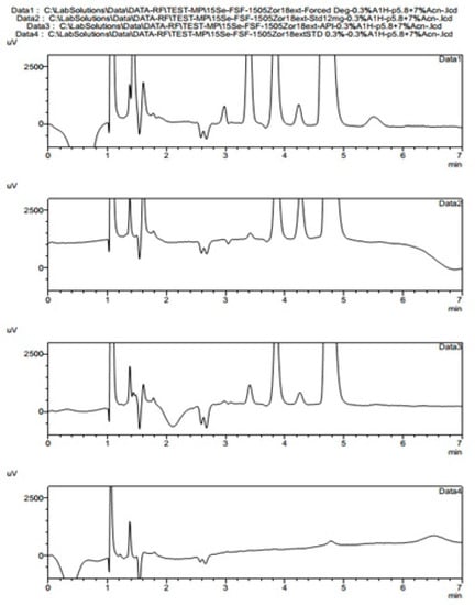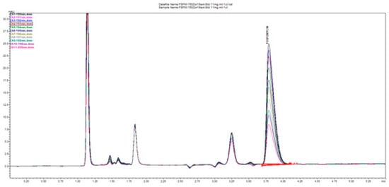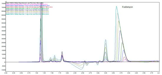Figure 20 shows good separation and acceptable peak symmetry of all. The most sensitive peak in wavelength change is fosfomycin, as noticeable. Figure 20 clearly presents depending on fosfomycin peak size and shape depending on the concentration of analyzed samples or dependence of analyte quantity on the column injected. This figure illustrates common phenomena in liquid chromatography by presenting a typical column mass overload situation, which is necessary in cases when an extremely low response factor analytes need to be determinated, and to achieve an adequate range of linearity and sensitivity. The remarkably visible peak spreading in leading mode is classical mass overload phenomenon, clearly explained in all HPLC handbooks and theory. The power and applicability of the method, with the use of Zorbax C18 extended to 150 mm × 4.6 mm, 5 μm column with a mobile phase of 0.3% v/v 2-aminoheptane pH adjusted to 5.8 and mixed with 7% acetonitrile, showed very interesting results. We prepared samples in solvents as described in pharmacopoeias (BP, USP, EP) with a dissolution of 600 mg of fosfomycin trometamol in 5 mL mobile phase 10.6 g/L NaH2PO4 (80 mM) for analysis with pharmacopoeial methods, standard fosfomycin trometamol, active pharmaceutical ingredient and standard subjected to forced degradation at 60 °C overnight. These prepared samples were 11x diluted with our mobile phase as described above with 2-aminoheptane and obtained the results presented in Figure 21. Fosfomycin has a tR = 4.8 min, and seven peaks appeared, and increased after thermal incubation at 60 °C. The peak of 0.3% fosfomycin appears with S/N ratio of more than 6 and can be increased if needed.