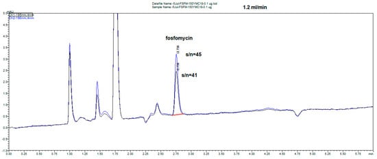 Chromatograms of a standard solution of fosfomycin trometamol 30 mg/mL, on the Discovery C18 150 mm × 4.6 mm, 5 μm column, with the mobile phase with mixed 6% acetonitrile, 94% of 10 mM KH2PO4 and 0.2% hexylamine, pH = 6.1, at 195 nm, for comparison of sensitivity, worked on Dionex Ultimate 3000.