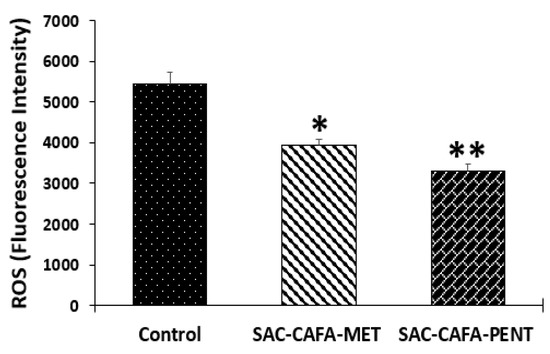Intracellular ROS induced by the hybrids SAC-CAFA-MET (124.2 µM) and SAC-CAFA-PENT (118 µM) or 1% DMSO (control) in SW480 cells. The fluorescent dye CM-H2DCFDA was used. Data are presented as the mean ± SE of three independent experiments; p-values lower than 0.05 were considered statistically significant (* p < 0.05; ** p < 0.01).