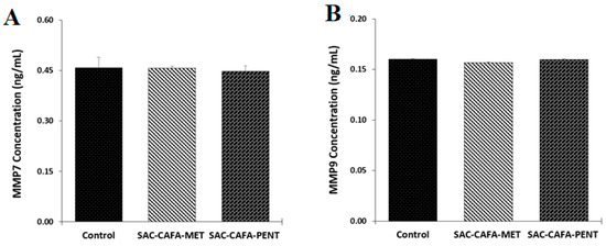 Concentrations of matrix metalloproteinase 7 (MMP7) (A) and MMP9 (B). Data are presented as the mean ± SE of three independent experiments.