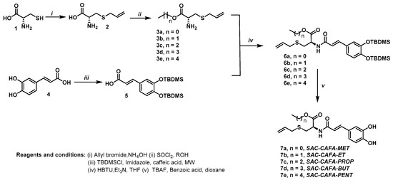 The synthesis of the hydroxylated compound SAC-CAFA, together with the full characterization and other biological activities, was previously reported by Castrillon et al. (2019) [29]. Scheme 1 shows a brief description of the route used for the synthesis of the molecules. The reaction of nucleophilic substitution between cysteine (1) and allyl bromide gave the S-allyl cysteine (2), which was esterified with the corresponding alcohol in the presence of thionyl chloride, obtaining compound 3. On the other hand, the phenolic hydroxyl groups of caffeic acid were protected as tert-butyldimethylsilyl (TBDMS), providing compound 5. Then, compounds 3 and 5 were submitted to peptide-type coupling using N,N,N’,N’-tetramethyluronium hexafluorophosphate (HBTU) as an amide bond promoter, yielding compound 6. Finally, the hybrid SAC-CAFA was obtained via the deprotection of compound 7.