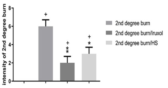 The effect of HS on the intensity of 2nd degree burns is presented in Figure 1. At the end of the experiment, the burn group showed a significant elevation in the intensity of the burn compared with that of the normal unexposed group. The Iruxol-treated group showed that the intensity was significantly decreased to 40% compared to the burn group, whereas it was significantly increased only to 20% compared to the normal group. The HS-treated group showed that the intensity was significantly decreased by 50% compared to the burn group and was significantly increased to 30% compared with the normal group.