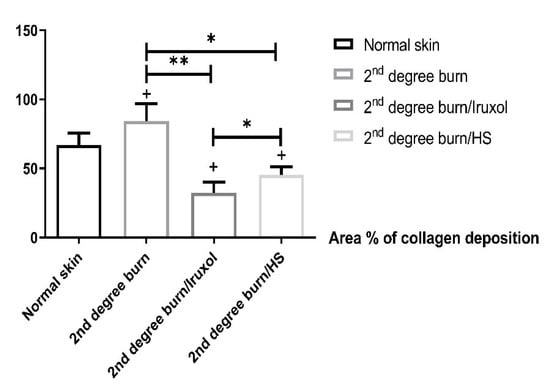 The effect of HS on collagen deposition is shown in Figure 2. Collagen deposition significantly increased in the burn group compared with that of the normal group. Collagen deposition was significantly decreased in the Iruxol-treated group compared to the burn group (p < 0.01). Additionally, the HS-treated group showed a significant decrease in collagen deposition compared to that of the burn group (p < 0.05).