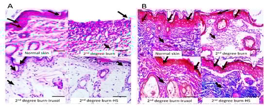 Histopathological examination of skin tissues from different groups by H&E staining. The left panel (A) shows histopathological examination of skin tissues from different groups by H&E staining, ×200. The normal epidermal layer formed of stratified epithelium with marked keratinization and normal dermal layer (arrows). The 2nd degree burn group exhibited a minimal degree of epithelialization (arrow) with subepithelial edema (short arrow). In contrast, treatment with Iruxol resulted in marked epithelialization degree (arrow) and normal dermal hair follicle appendages (short arrow). Treatment with HS resulted in marked epithelialization (short arrow). Bar = 100 µm. The right panel (B) illustrates the Masson’s trichrome staining, ×200. Masson’s trichrome staining indicated the normal dermal layer (arrows) and primary parallel collagen (short arrow). The 2nd degree burn group was associated with disturbed epithelia (arrows) and massive dermal collagen formation (short arrow). In contrast, treatment with Iruxol resulted in a less disturbed dermal layer (arrows) and minimal dermal collagen formation (short arrow). Additionally, treatment with HS resulted in a less disturbed dermal layer (arrows) and minimal dermal collagen formation (short arrow). Bar = 100 µm.